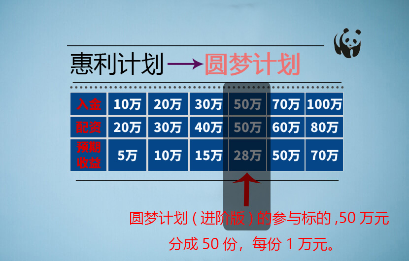 圆梦计划(进阶版)是在圆梦计划(体验版)的基础上优化而成的。进阶版的投资标的是惠利计划的50万这个挡位。50万的参与金额分成50个份额,每个份额1万元。