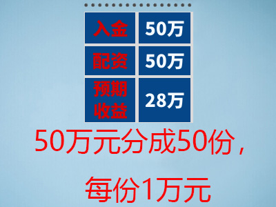 这50万元分成50个份额,每个份额是1万元。您可以自由选择想认筹的份数,比如1份、10份等等。一个操作周期完成后,您获得的收益是每个份额的收益乘以您认筹的份数。